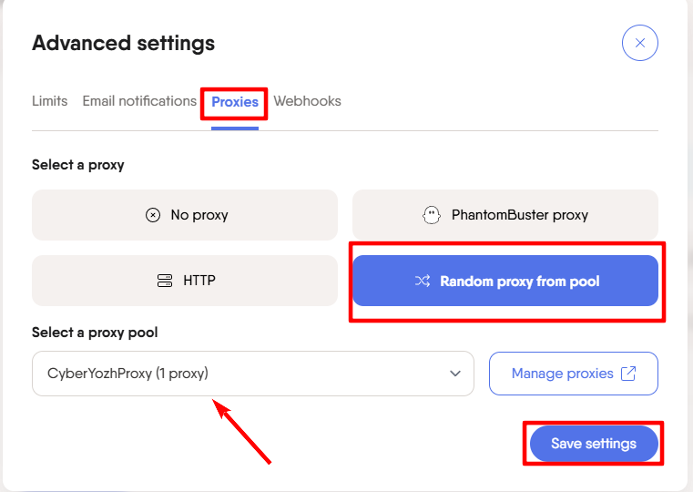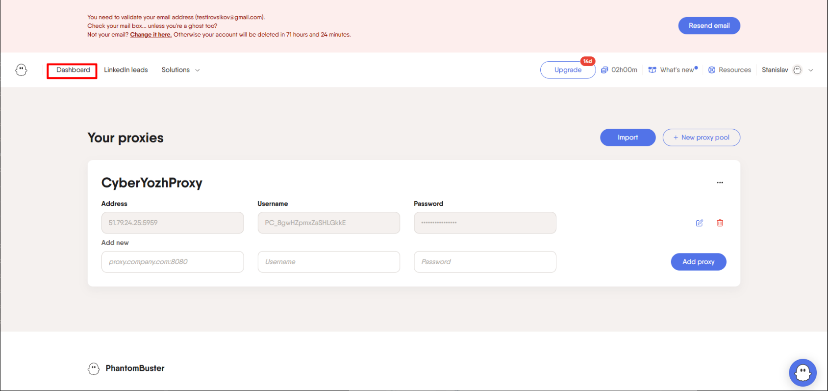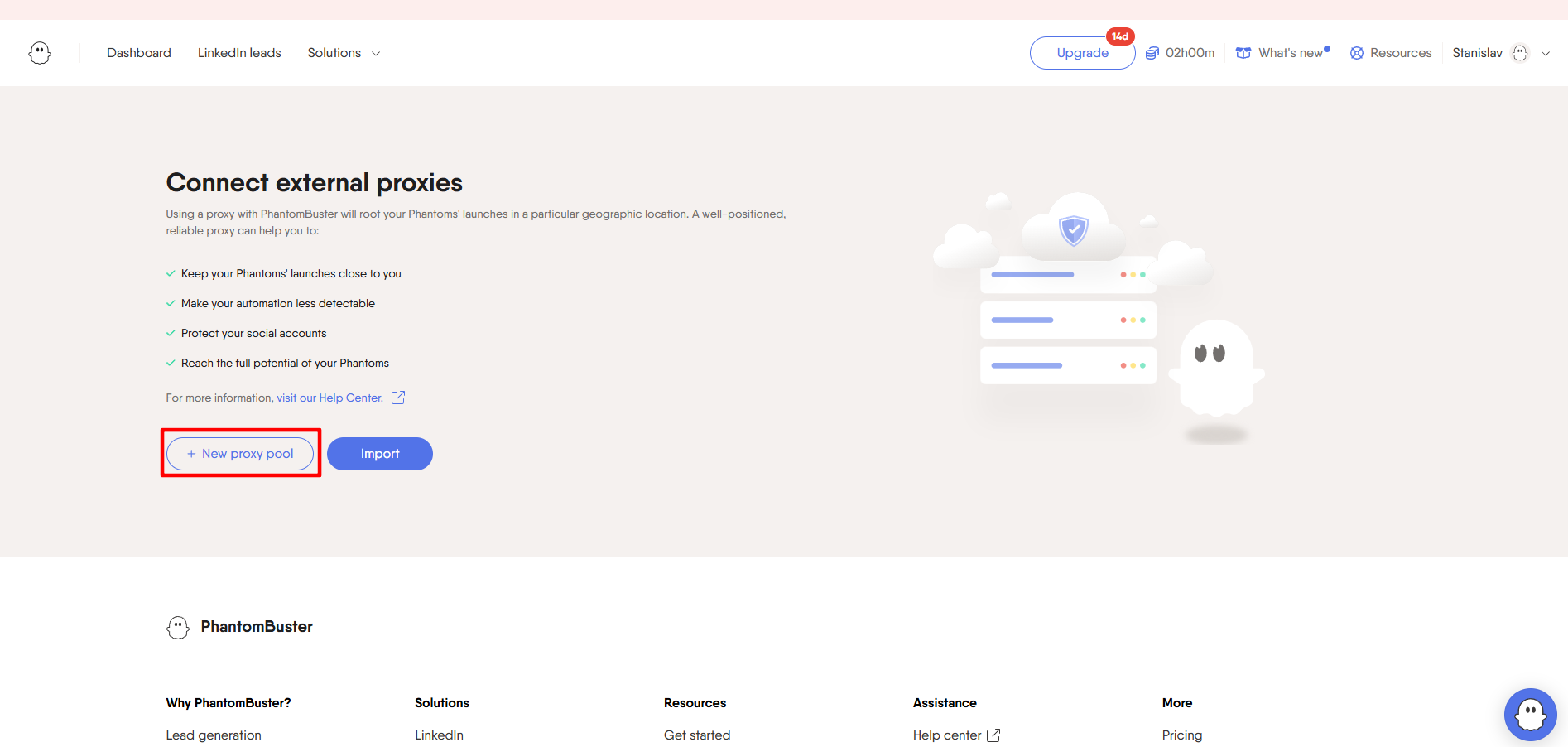 В PhantomBuster лучше всего использовать Proxy Pools (Пулы прокси). Это позволяет один раз добавить прокси и потом легко назначать его разным Фантомам.