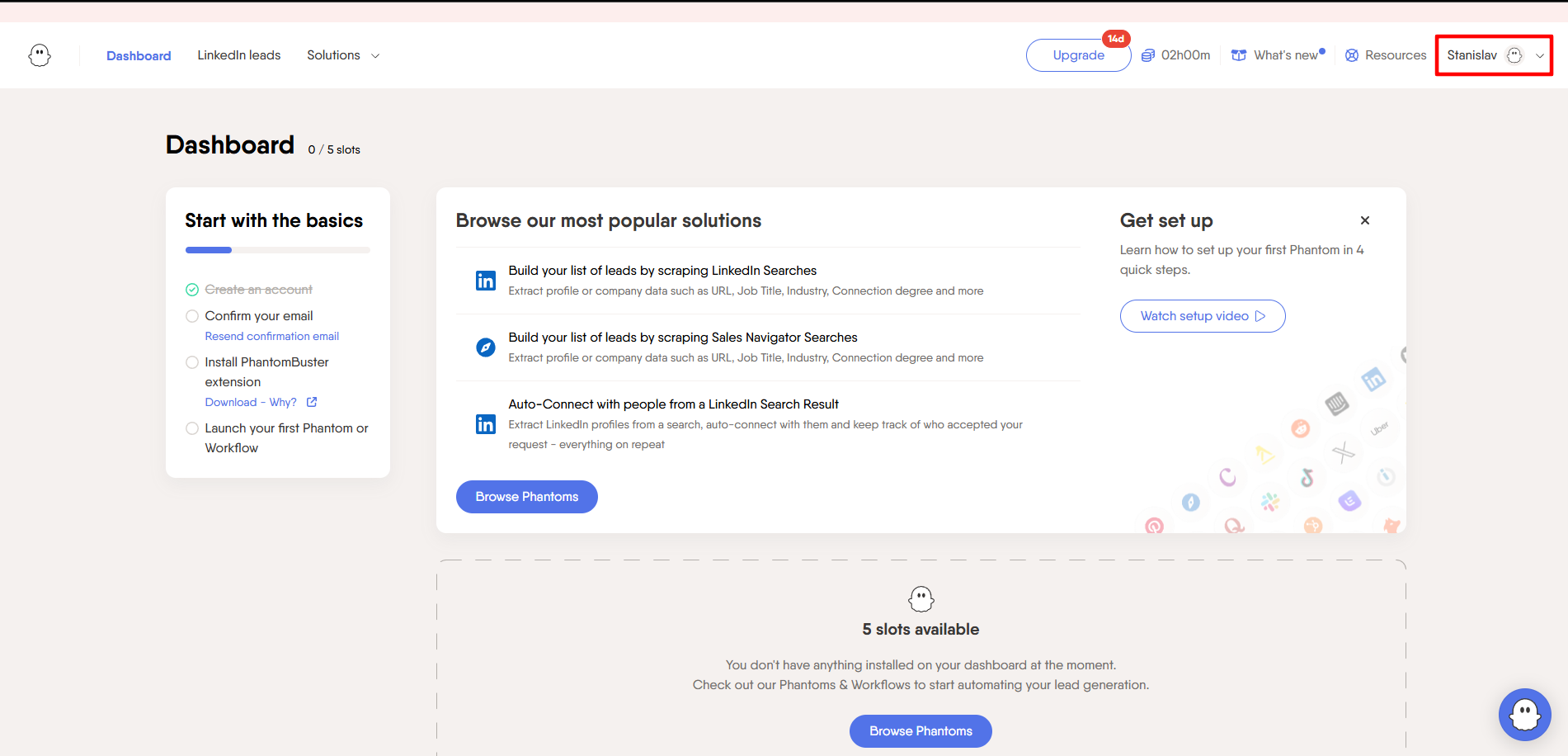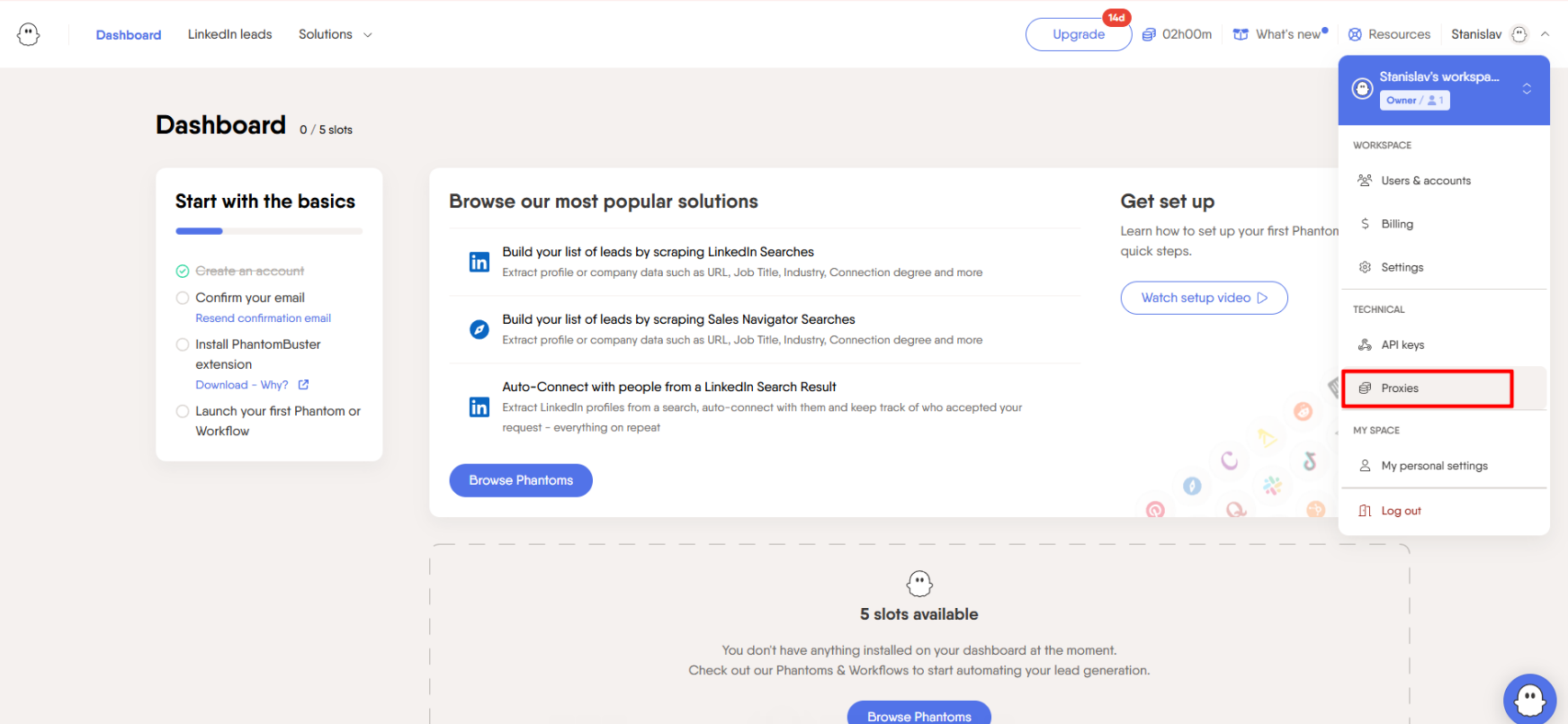Рис. 2. Интерфейс панели управления PhantomBuster, демонстрирующий верхнюю навигационную панель с элементом профиля пользователя, расположенным в правом верхнем углу.В выпадающем меню выберите Proxies.
