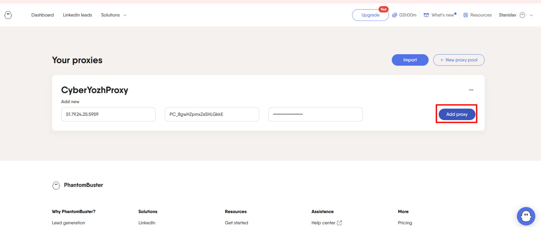Введите данные вашего прокси. PhantomBuster принимает их в формате: ip:port:login:password