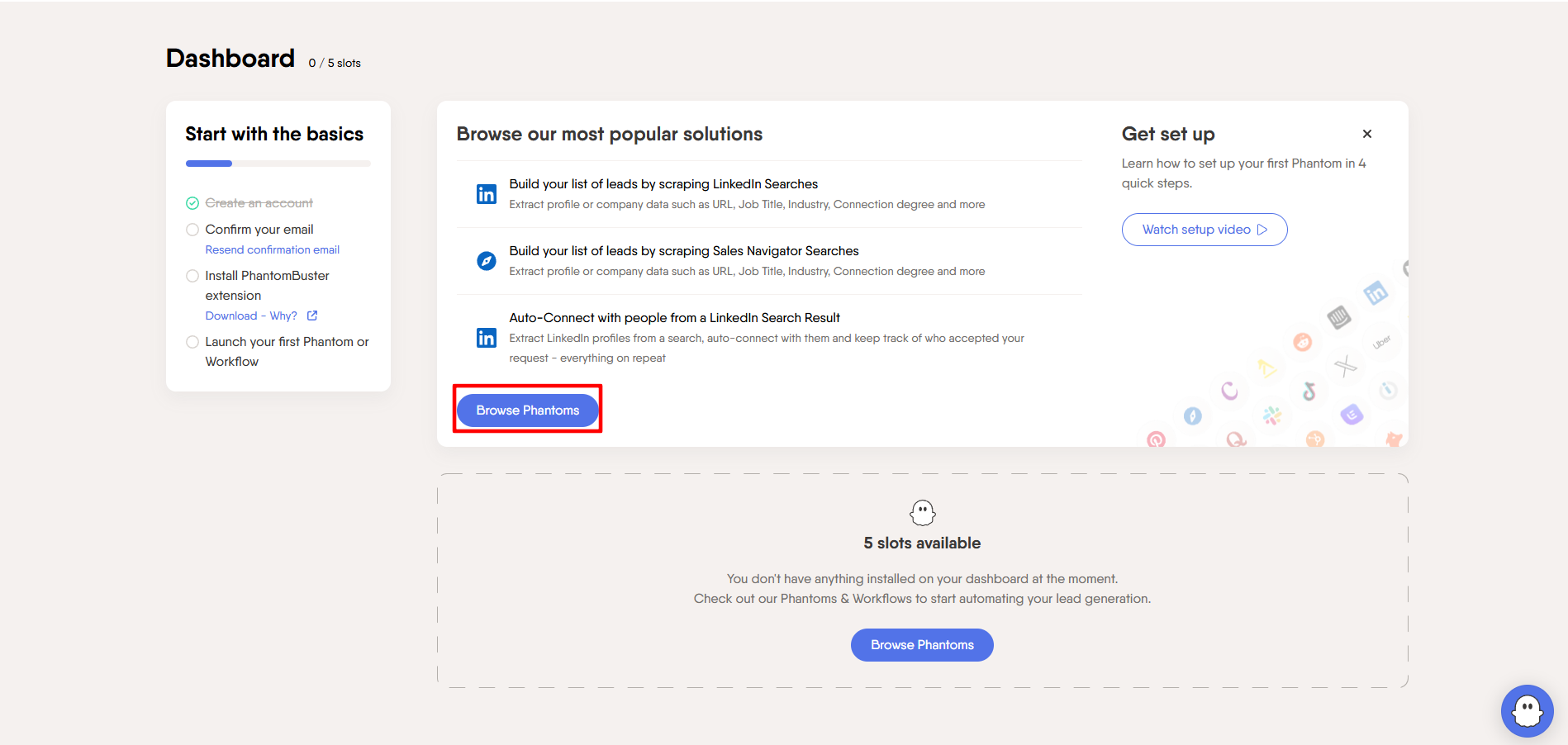 Рис. 7. Пользовательский интерфейс панели управления PhantomBuster, демонстрирующий навигационный элемент "Dashboard".