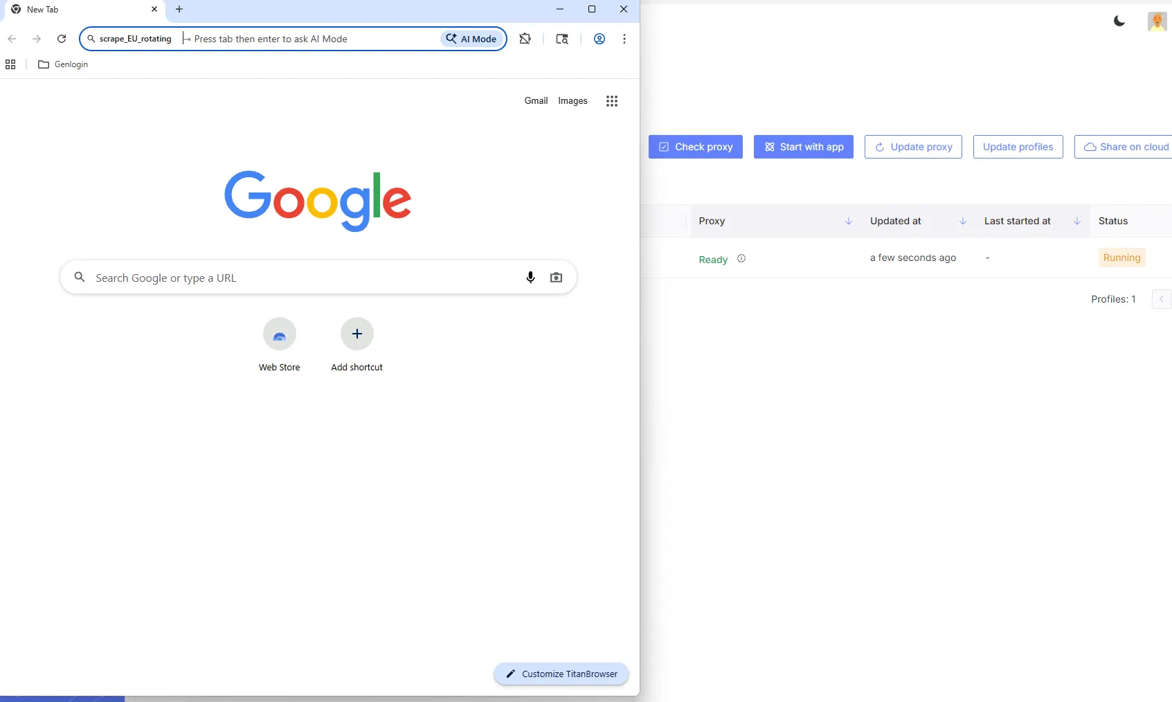 Виключний Titan Browser. Користувацьке ядро на основі Chromium у GenLogin імітує поведінку людини при переглядові веб-сайтів, підвищуючи автентичність та безпеку керованих акаунтів. На відміну від стандартних форків Chromium, воно регенерує відбитки з наборів даних реальних пристроїв, а не емулює їх.