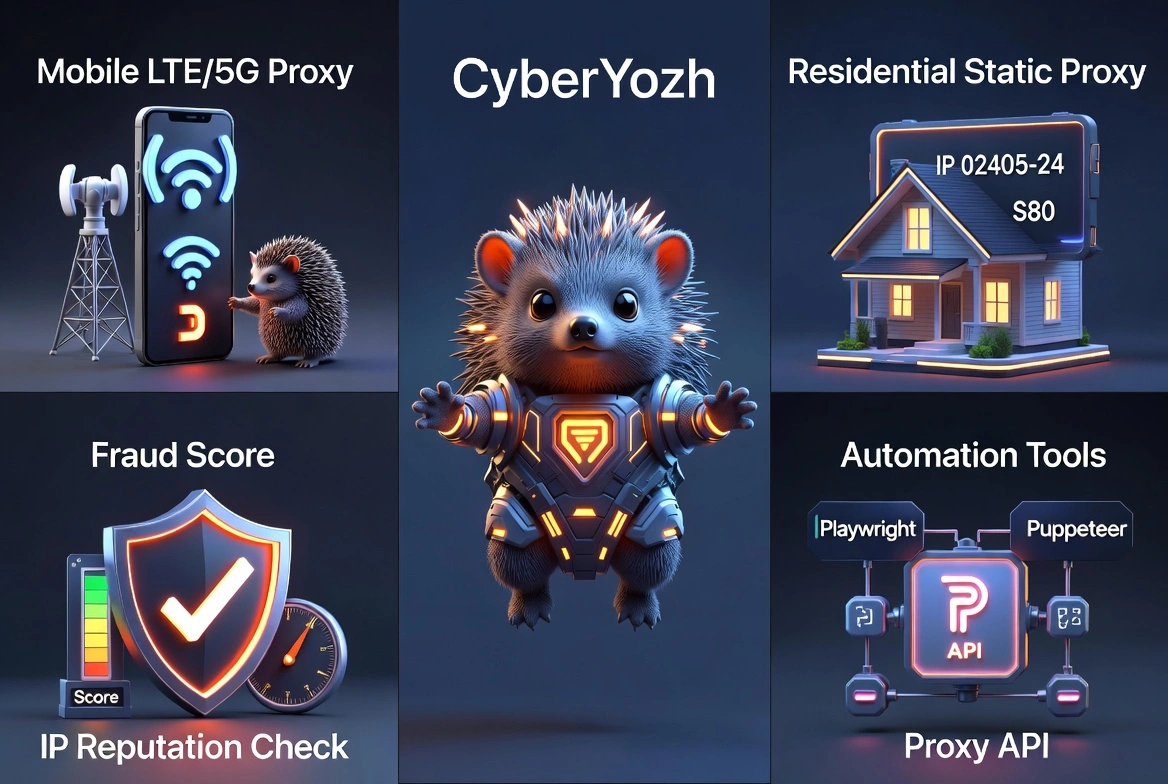 CyberYozh надає мобільні LTE/5G, резидентські та проксі датацентру, а також перевірку рейтингу шахрайства IP, щоб ви могли перевірити IP перед використанням з Telegram Web.
