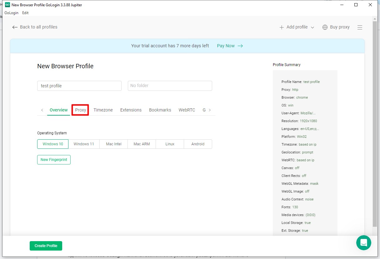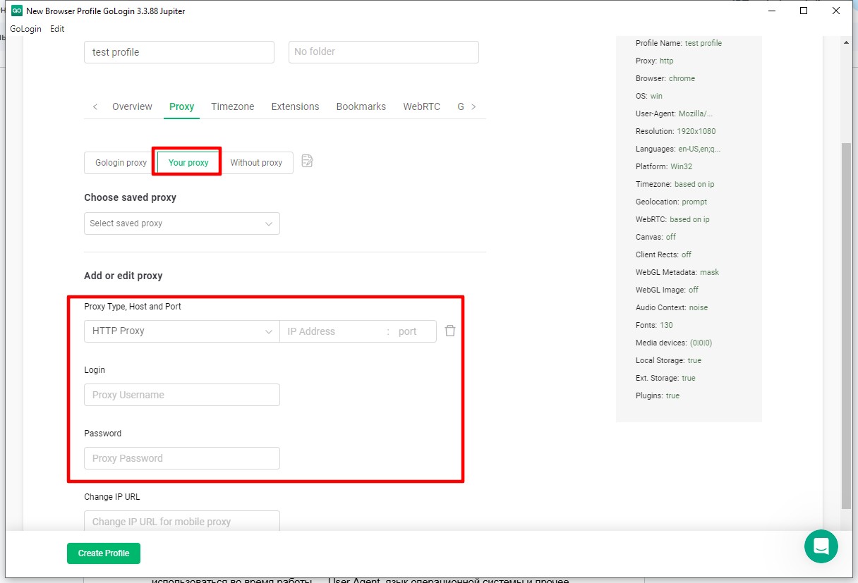 Запустіть GoLogin. У верхній панелі натисніть кнопку Add Profile (Додати профіль). Відкриється вікно детального налаштування.