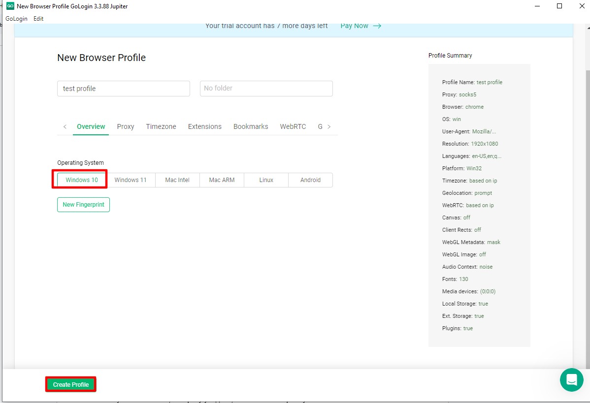 Натисніть Create Profile внизу вікна.