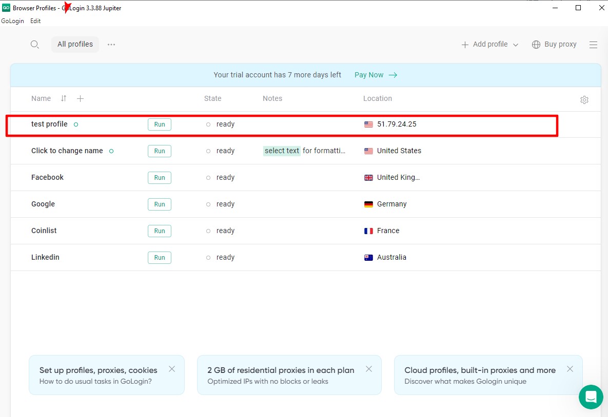 Рис. 7. Запуск створеного профілю GoLogin