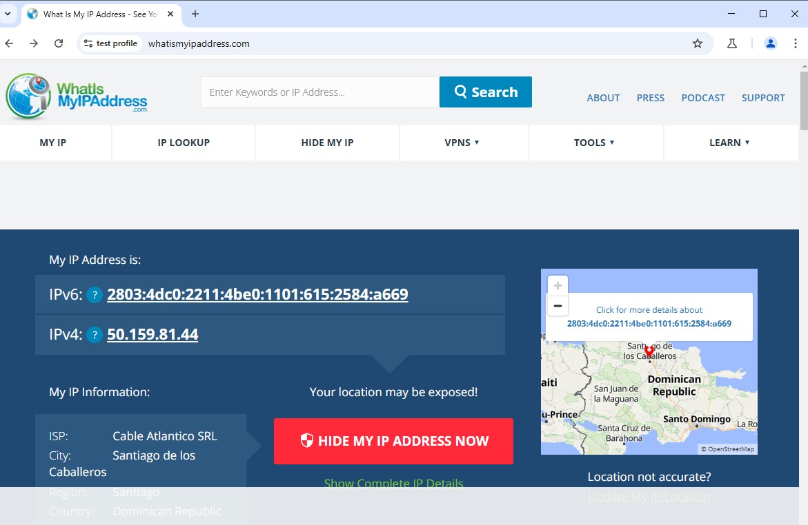 Рис. 8. Результати перевірки налаштувань анонімності у сервісі whatismyipaddress.com, що демонструють ефективність маскування IP-адреси через налаштований проксі-сервер GoLogin.