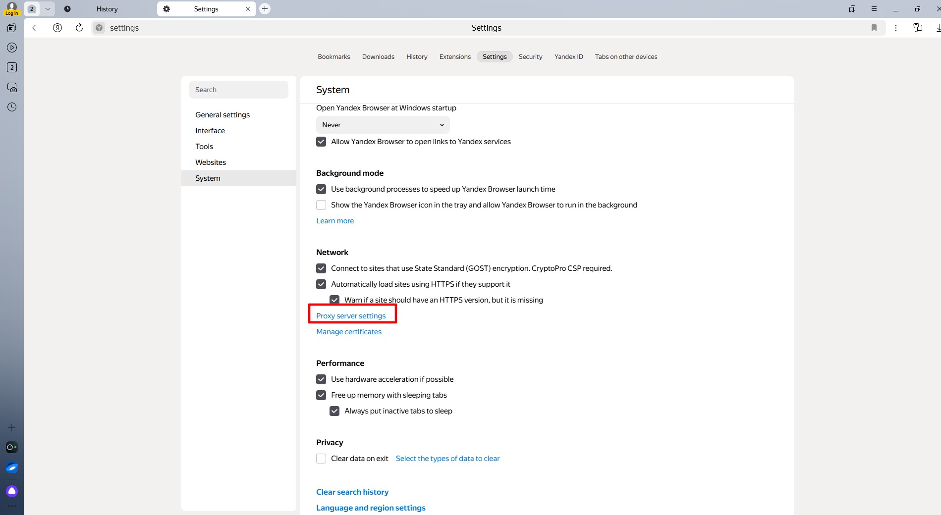 Головна технічна особливість Яндекс.Браузера: він використовує системні налаштування проксі. Це означає, що браузер не має свого окремого шлюзу, а спрямовує трафік через налаштування Windows.