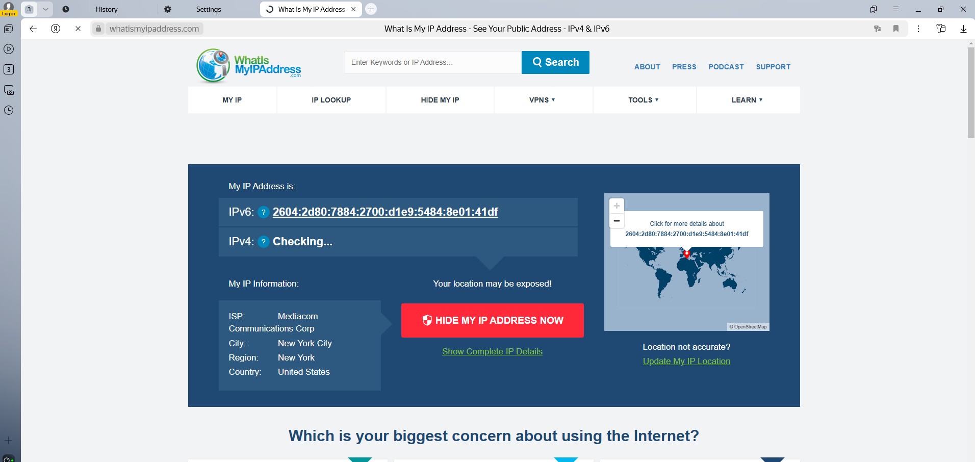 Рис. 6. Інтерфейс сервісу перевірки IP-адреси, що демонструє результати визначення поточного місця розташування та IP-адреси після налаштування проксі-сервера. Зображення підтверджує успішність конфігурації проксі шляхом відображення зміненої IP-адреси та геолокації.