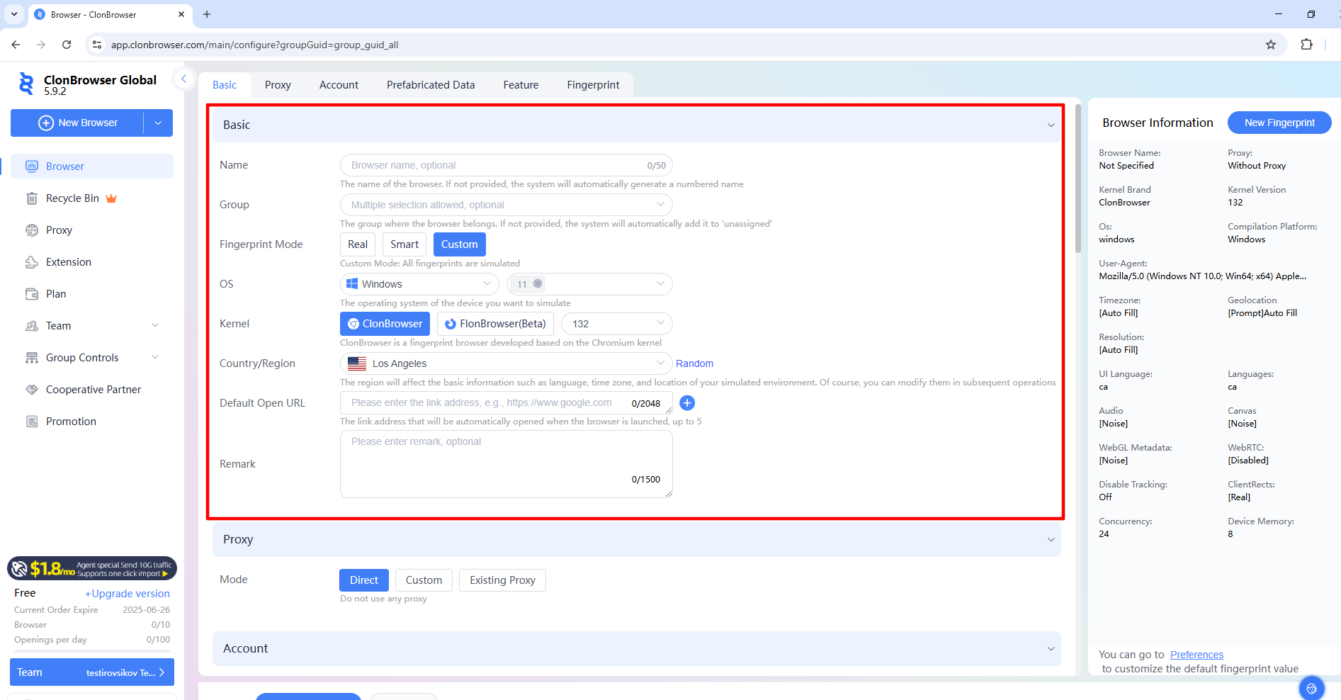 ClonBrowser — là một trình duyệt mạnh mẽ để làm việc đa hồ sơ, cho phép quản lý hiệu quả nhiều không gian làm việc từ một máy tính duy nhất. Nó tạo ra các hồ sơ ảo riêng biệt, mỗi hồ sơ có cấu hình duy nhất: độ phân giải màn hình, phiên bản hệ điều hành, phông chữ và các thông số WebGL.