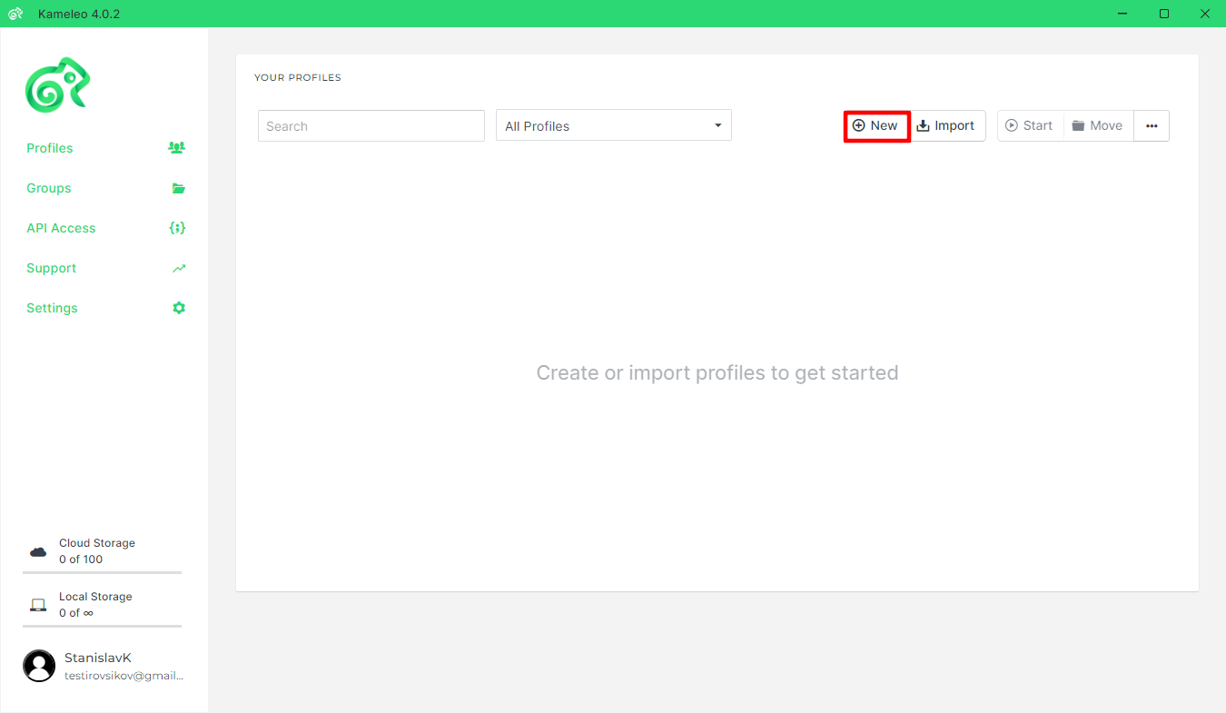 Mở Kameleo. Trên màn hình chính, nhấn nút "New Profile" (Hồ sơ mới).