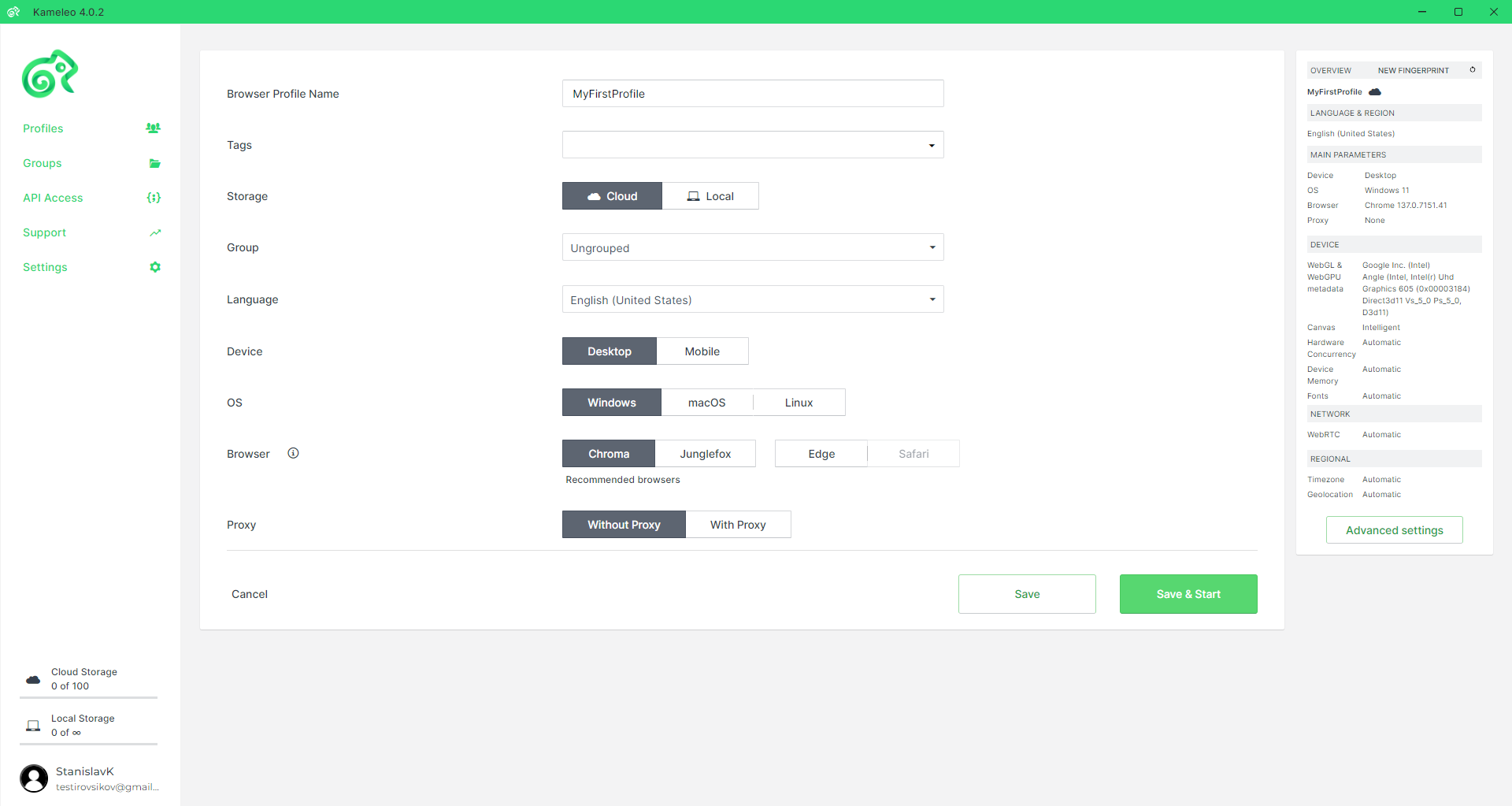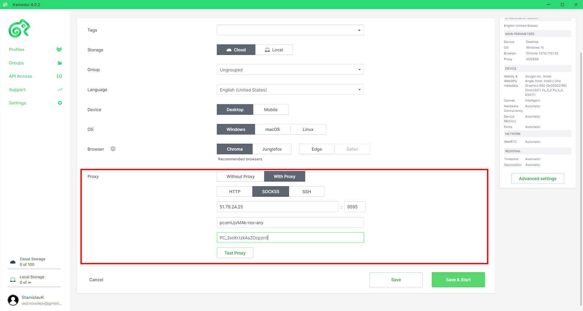 Hình 6. Giao diện lưu hồ sơ trong chương trình Kameleo. Hình ảnh minh họa việc khởi chạy hồ sơ đã cấu hình với các thông số kết nối proxy đã thiết lập.