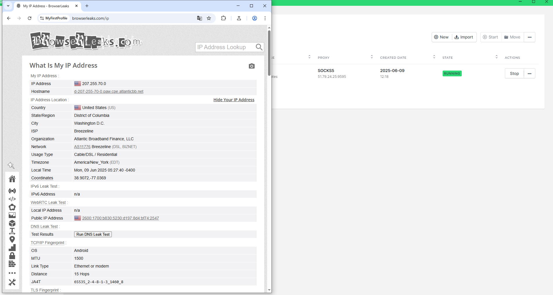 Hình 7. Giao diện kiểm tra địa chỉ IP trong trình duyệt Kameleo thông qua dịch vụ Browserleaks. Hình ảnh hiển thị kết quả thiết lập kết nối proxy thành công, cho thấy việc hiển thị chính xác địa chỉ IP đã thay đổi và các thông số mạng liên quan.