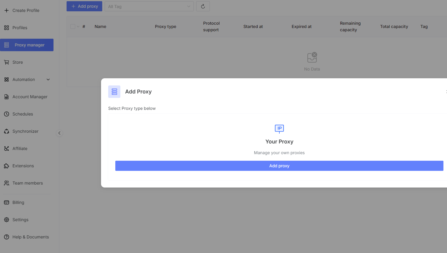 Nếu bạn đang cấu hình nhiều hồ sơ GenLogin trên quy mô lớn, hãy vào Trình quản lý Proxy ở thanh bên trái và nhấp vào Thêm Proxy.