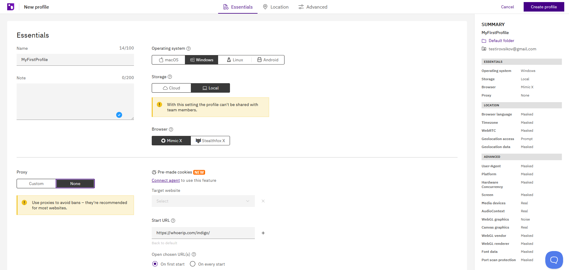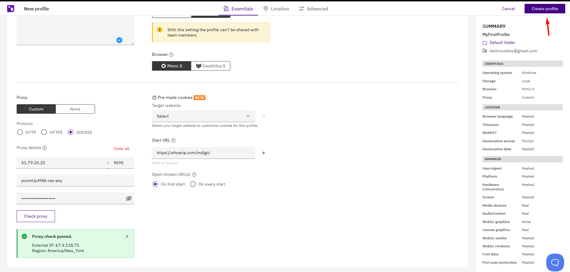 Hình 6. Giao diện Indigo ở giai đoạn cuối cùng của việc tạo hồ sơ. Nút "Create Profile" hoàn tất quá trình thiết lập hồ sơ mới.