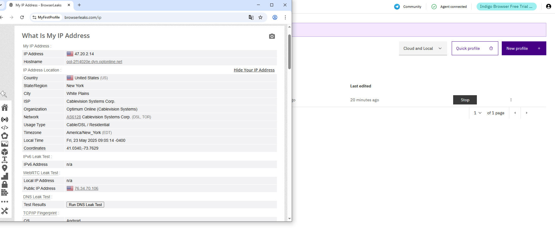 Hình 8. Trang web dịch vụ kiểm tra địa chỉ IP, hiển thị kết quả kiểm tra kết nối proxy trong hồ sơ Indigo.