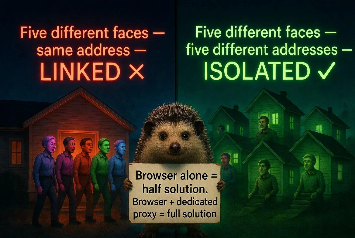 如果没有为每个配置文件配对代理,仅靠指纹隔离会失败;平台仍会通过共享IP地址关联账户。