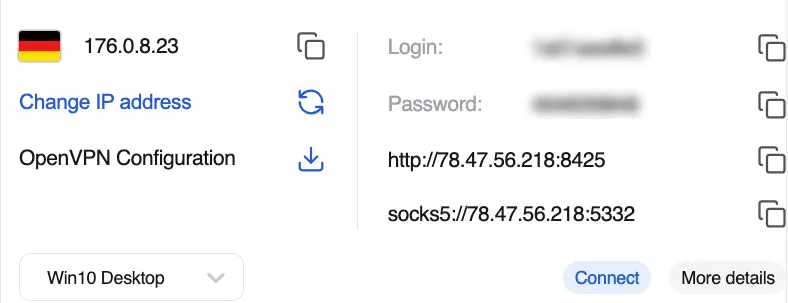 登录您的 CyberYozh 仪表板,点击添加代理,选择适合您任务的代理类型,然后进入我的代理页面获取您的凭据:主机地址、端口、用户名和密码。