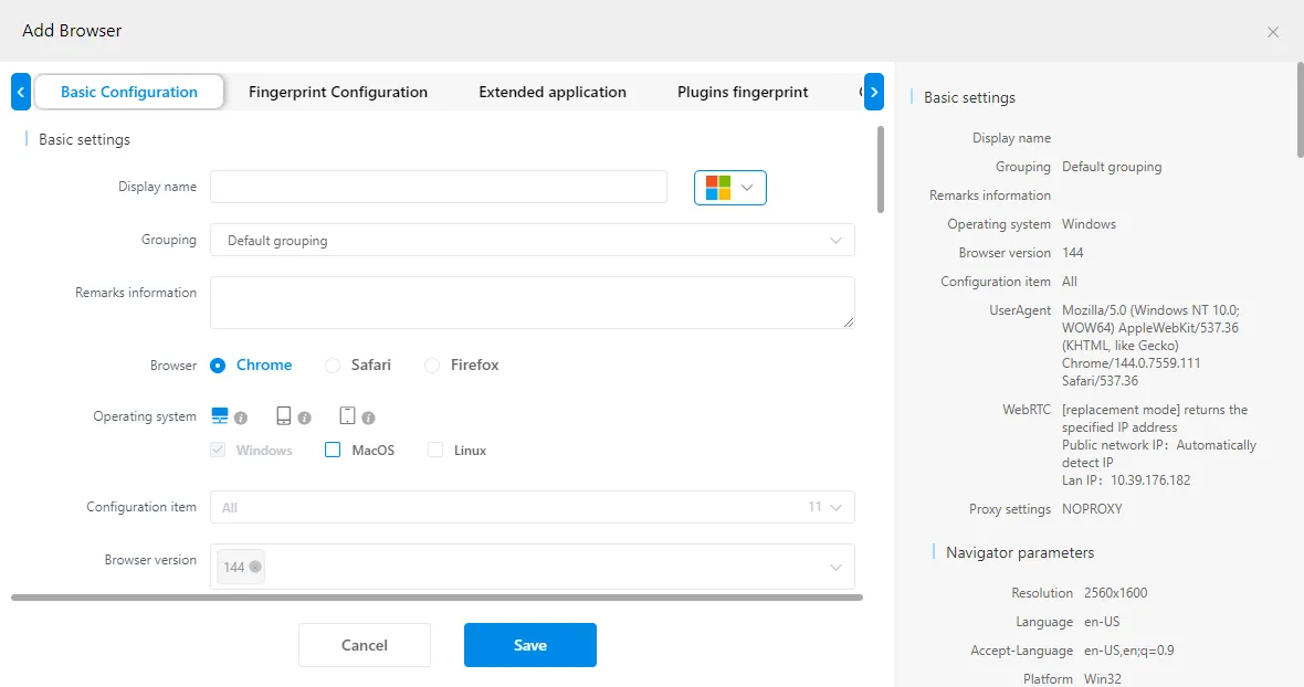 • WebRTC behavior, Canvas, WebGL, fonts, and other fingerprint parameters.